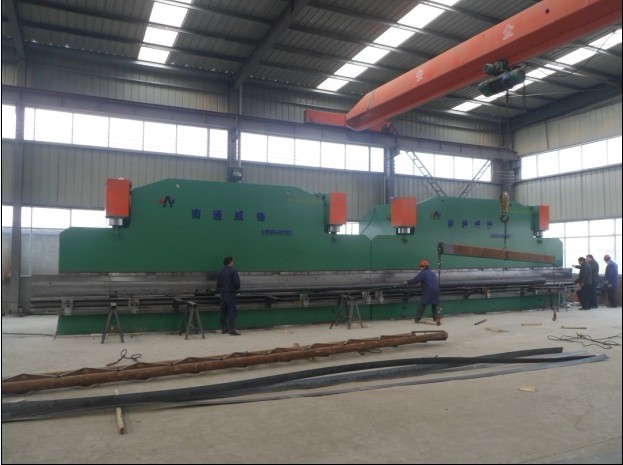 选用两台WC67Y系列同规格主机,配置双机联动同步系统; 两台机床同时使用可以加工特长工件,也可以同时单独使用,从而提高生产效率; 上模配有挠度补偿机构,确保加工工件的精度; 机械挡块,扭轴,同步阀控制同步; 后档料距离,上滑块行程电动调节,数字显示;